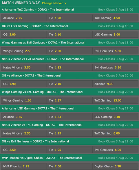 Bet365 Wettquoten – Gruppe des Gewinners Wettquoten – GruppengewinnerWettquoten – Match Sieger – Gruppenphase Tag 1 Wettquoten – Match Sieger – Gruppenphase Tag 2 zu den aktuellen Quoten bei Bet365 >> Die Dota 2 – TI6 Quoten auf Bet365 findet ihr im Menü Links: E-Sports > Dota 2 << Zurück zur Dota 2 Wettanbieter Übersicht
