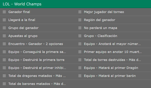 Apuestas especiales y en vivo de la Fase Grupal | Mundial de LoL Tabla de Contenido Cuotas de apuestas de la fase grupal de Mundial de League of Legends 2017 El Campeonato Mundial de League of Legends 2017 comenzará oficialmente el 5 d eoctubre con la Fase de Grupos #1 y los sitios de apuestas ya han preparado una variedad de apuestas para ti. Queremos informarte de las tres apuestas especiales que están enfocadas solamente para la Fase Grupal: grupo del ganador, clasificación del grupo y apuestas al grupo. Además de estas tres opciones, también hay muchas otras cuotas, puedes apostar a cada partido de la fase de grupos y las eliminatorias, así como también al ganador final del Mundial de LoL 2017, por favor ten en cuenta que las cuotas pueden cambiar con el tiempo, así que tendrás que revisar la página web del sitio de apuesta si quieres tener las cuotas actualizada. Si no tiene una cuenta de apuestas, pero te gusaría apostar en el LoL Worlds 2017, entonces denerías revisar nuestro artículo de las reseñas de los sitios de apuestas eSports. También puedes realizar una quiniela y apostar sin utilizar dinero real en el reto Pick'Em para el Mundial de LoL 2017. Cuotas de apuestas de la fase grupal de Mundial de League of Legends 2017 Aquí tienes un breve listado de las apuestas para el Mundial de LoL 2017. Si quieres leer más sobre las opciones de apuestas como “ganador final”, “equipos en llegar a la final”, etc, entonces mira nuestro resumen de las cuotas de apuestas del Mundial de LoL 2017. Apuestas de esports – Bet365: Cuotas de Apuestas actuales en bet365 BET365: Encuentra las apuestas de LoL en el menú de la izquierda: E-Sports Atencion: Las cuotas mostradas son sólo orientativas y están sujetas a cambios desde bet365. Por favor, compruebe las cuotas en el sitio bet365 antes de realizar cualquier apuesta. Cuotas de apuestas al grupo del ganador | Mundial de LoL 2017 Luego de que el sorteo de grupos finalizó, ya hay cuotas para el ganador del grupo, es decir, de dónde vendrá el ganador del torneo. Por supuesto, el grupo A y el grupo B son los favoritos, ya que en ellos se encuentran Longzhu Gaming y SK Telecom T1, mientras que el grupo D tiene un rol de forastero, es decir, ningún equipo es coreano, y los mejores equipos en este grupo con Team SoloMid y Team WE. Apuestas para la clasificación del grupo del Mundial de LoL 2017 La opción de clasificación del grupo es para seleccionar qué equipo llegará a la fase eliminatoria del torneo. Que los coreanos pierdan durante la fase grupal y no clasifique, es casi imposible, pero la pelear por el segundo lugar del grupo B y el grupo D será bastante emocionante. Cuotas de apuestas al grupo Las cuotas de apuestas a la fase grupal del Mundial de LoL 2017 son bastantes similares a las cuotas de la clasificación del grupo, pero ahora podrás tomar mayores riesgos. En este caso, tendrás que apostar en el equipo que será el ganador de su respectivo grupo. En el grupo D las cuotas son casi iguales aunque Team WE es ligeramente favorecido. Puedes leer un resumen de cada grupo en nuestros artículos del Grupo A | Grupo B | Grupo C | Grupo D. Apuestas de esports – Bet365: Cuotas de Apuestas actuales en bet365 BET365: Encuentra las apuestas de LoL en el menú de la izquierda: E-Sports Live Betting for the Group Stage of the LoL Worlds 2017 Hasta ahora hemos hecho apuestas que hay que hacer antes de la primera jornada. Sin embargo, también hay apuestas en vivo para todos los partidos, lo que significa que puedes apostar en un equipo mientras el partido ya está en curso. Hasta ahora sólo existe la posibilidad de apostar por el ganador del juego en vivo, todas las otras apuestas como “primera sangre” o “mayor cantidad de asesinatos” se cerrarán al principio del juego. También tienes que ser rápido para hacer una apuesta en vivo, porque tan pronto como ocurra algo que pueda afectar el resultado del juego (empieza la pelea de equipos, el campeón muere, la torre es destruida,…) la apuesta se suspende por un momento y se vuelve a calcular. Los corredores de apuestas son a menudo demasiado cautelosos y atribuyen rápidamente la victoria a un equipo que ha ganado una ventaja razonable. Si las probabilidades para el equipo inferior después de una pelea o una torre perdida aumentan dramáticamente, deberías considerar apostar en este equipo en ese momento, ya que las probabilidades de apuestas probablemente no reflejan las probabilidades realistas 1:1. Una gran ventaja del sistema de apuestas en vivo es que puedes dejarlos inmediatamente después de la fase de selección sin tener diferentes probabilidades que antes. Así que si ves una composición de equipo claramente más fuerte, deberías apostar por ellos de inmediato. También podrías estar interesado en: League of Legends ─ Campeonato Mundial 2017 LoL Worlds 2017 ─ Fase de Apertura #1 (Play-In Stage) LoL Worlds 2017 ─ Cuotas de apuestas de la Fase de Apertura #1 LoL Worlds 2017 ─ Fase de Apertura #2 (Play-In Stage) LoL Worlds 2017 ─ Fase Grupal #1 LoL Worlds 2017 ─ Equipos y jugadores LoL Worlds 2017 ─ Casters, comentadores y analistas LoL Worlds 2017 ─ Cuotas de Apuestas LoL Worlds 2017 ─ Cuota de apuestas al ganador final LoL Worlds 2017 ─ Notas de la versión 7.18 del Mundial de LoL 2017 LoL Worlds 2017 ─ Clasificatorias LoL Worlds 2017 ─ Sorteo de grupos y Play-In stage LoL Worlds 2017 ─ Bolsa de Premios LoL Worlds 2017 ─ Programación y resultados LoL Worlds 2017 ─ Transmisión en Español / LATAM